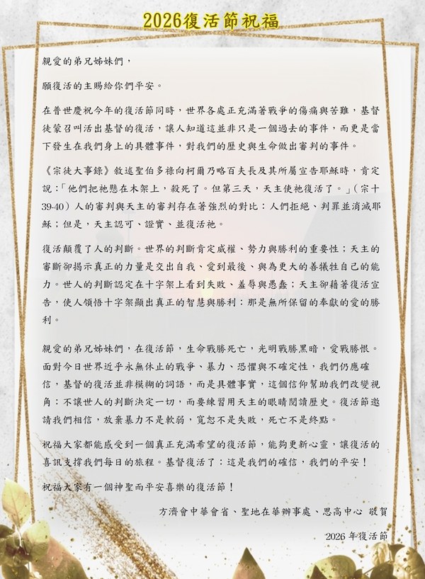 請點選連結完整閱讀2026年總會長的復活節信函(請點選)。