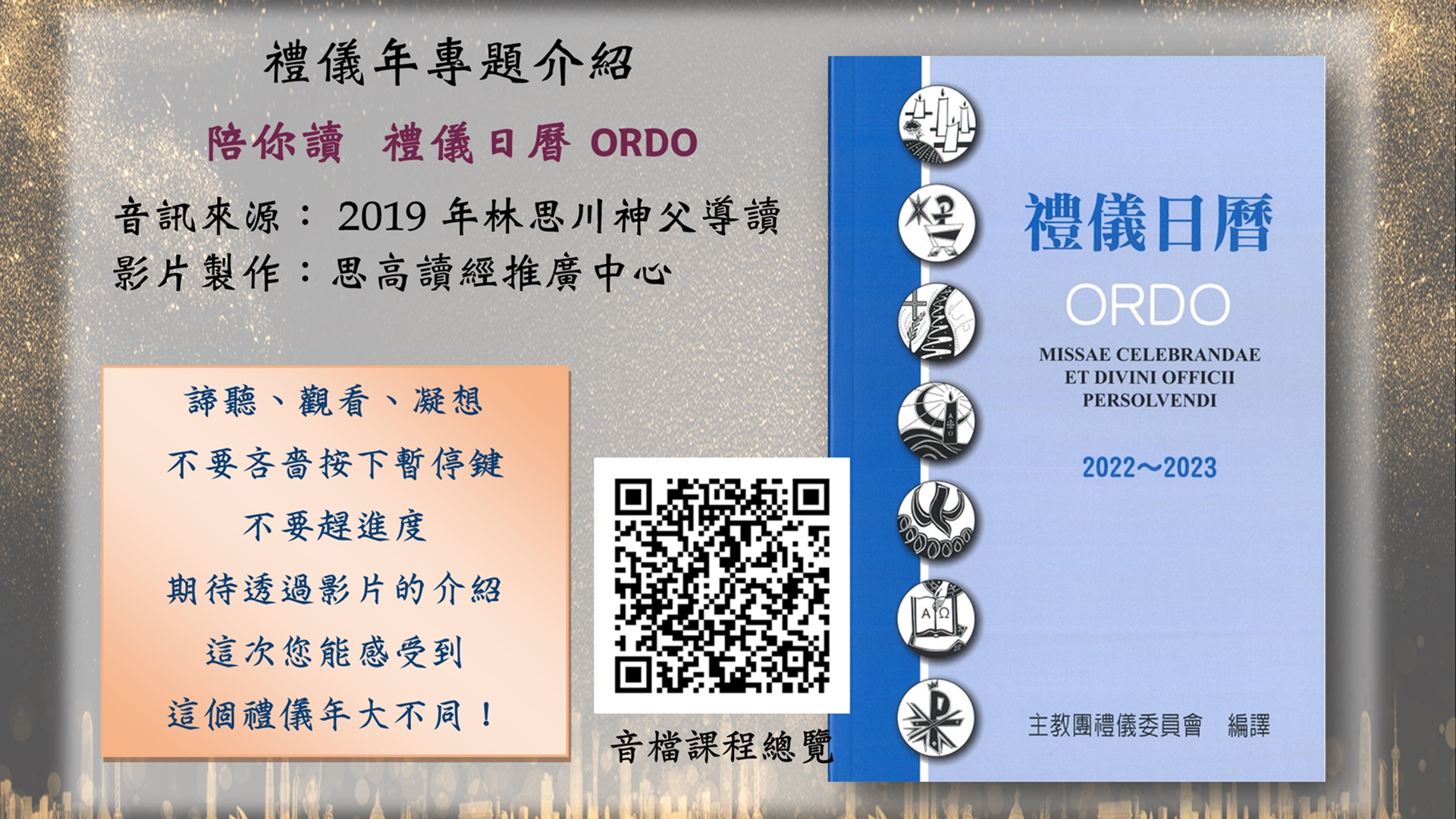 慈母教會規定一些日子,以神聖的紀念,慶祝其天上淨配的救世大業;在一年的週期中,發揮基督的全部奧蹟,從降孕、誕生,直到升天,聖神降臨,以致期待光榮的希望,及主的再來!唯有認識我們自己的禮儀脈絡,才能真正感受到耶穌的臨在不只在教堂內,更與我們的生活息息相關。 因此思高中心特別製作了【禮儀日曆ORDO導讀】專題,將林思川神父2019年導讀的『禮儀日曆』課程,重新進行影音編排製作,並加入豐富的資料,以詳盡生動的影音方式,將『禮儀日曆』再度介紹給大家。 【禮儀日曆ORDO導讀】專題,音檔課程內容共有三堂,影片製作按主題共分為六個影片檔,之後將不定時依序發布。本週以『專題介紹』影片開啟序幕,邀請您藉著這次的特別企劃,更加認識『禮儀日曆』!