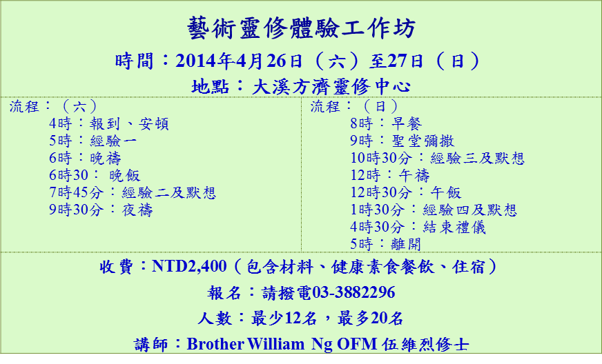 藝術靈修體驗工作坊 講師:伍維烈 修士 https://www.ccreadbible.org/Members/Bona/photo-dm/dm/2014/20140426workshop/view https://www.ccreadbible.org/Members/Bona/photo-dm/dm/2014/20140426workshop/@@images/image-1200-fb32e6ad7890a4d73190040baa394b9f.png 藝術靈修體驗工作坊 講師:伍維烈 修士 20140426workshop.png image/png Type image/png Dimension Dimension 872x528 Size File size 39.4 KB 下載 View full-size image